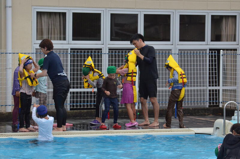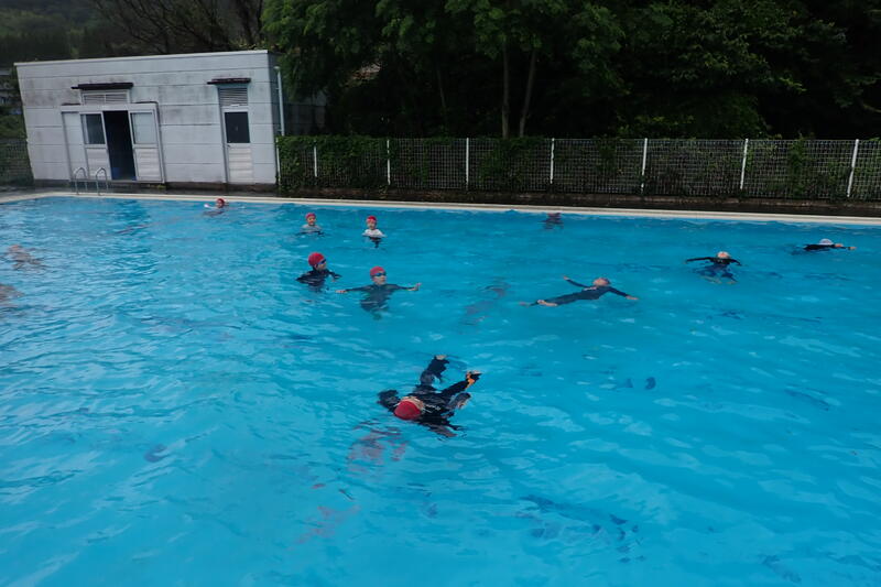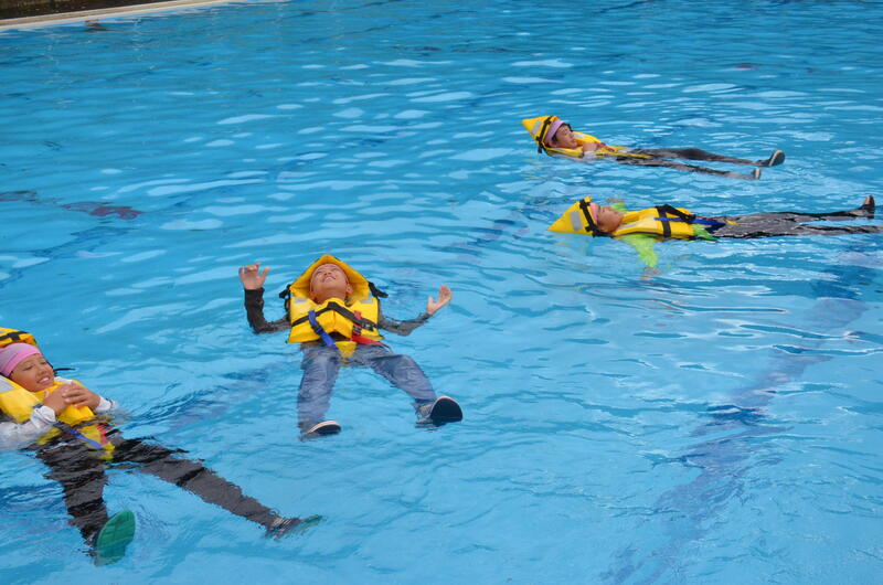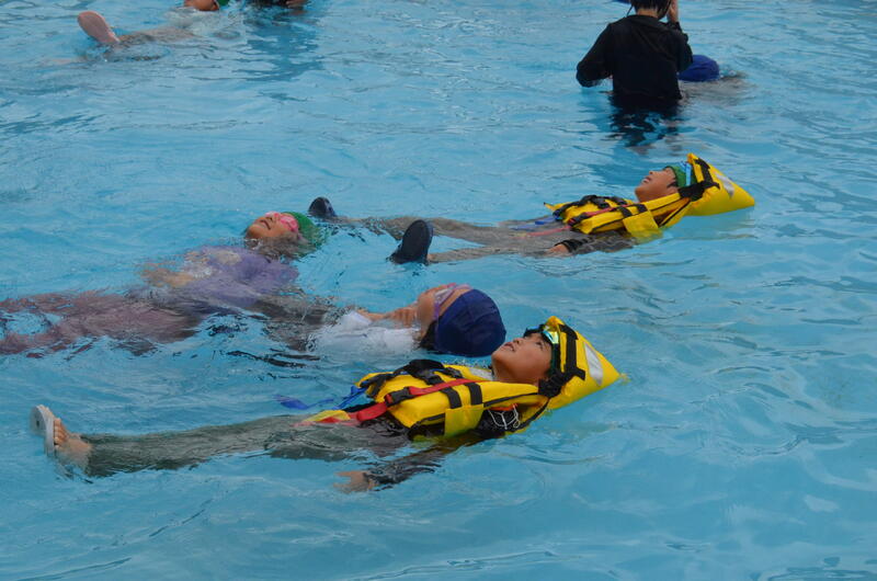 特に、今年度は教頭先生の計らいで、鏡消防署氷川分署からライフジャケットをお借りして、浮いて救助をまつ訓練もすることができました。