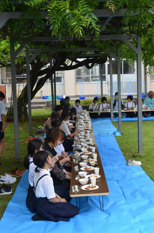 5月8日 藤棚の下で、5・6年生が民児協の方々をお迎えして、手作りの茶話会を開きました。