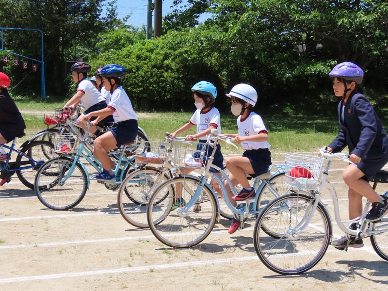 3年生から6年生は「自転車安全利用5則」の説明を受けて、実際に自転車にのって、発進の基本姿勢やブレーキのかけ方の実技練習をしたり、運動場に特設した道路や交差点を走りながら、安全確認の仕方や交通ルールを学んだりしました。