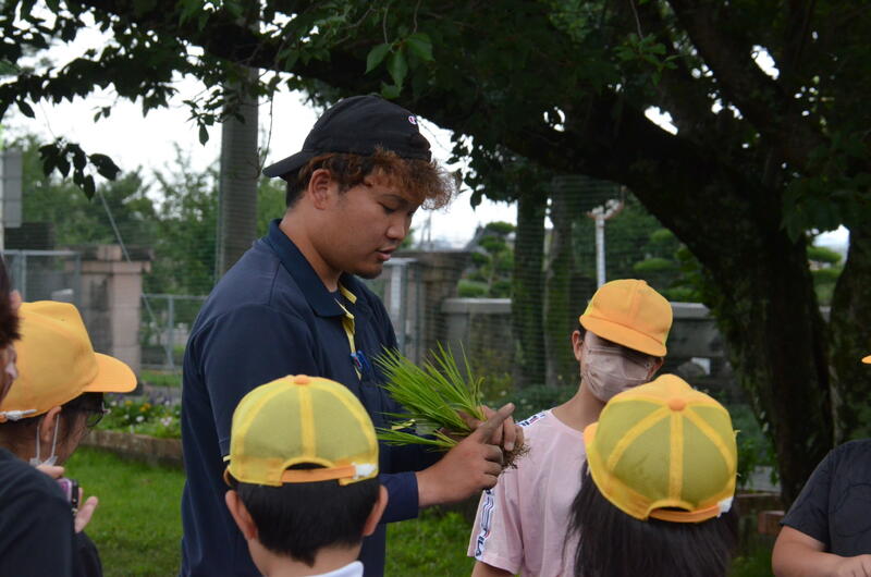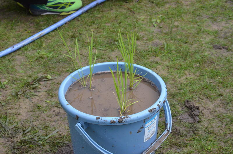 初めは乾いた土を手で触ることもおぼつかない子が、水と土を混ぜて、代かきの作業をするときには、バケツの底まで手を入れて、土と水を混ぜる作業をすることができていました。短時間でたくましく成長する姿を見ることができました。