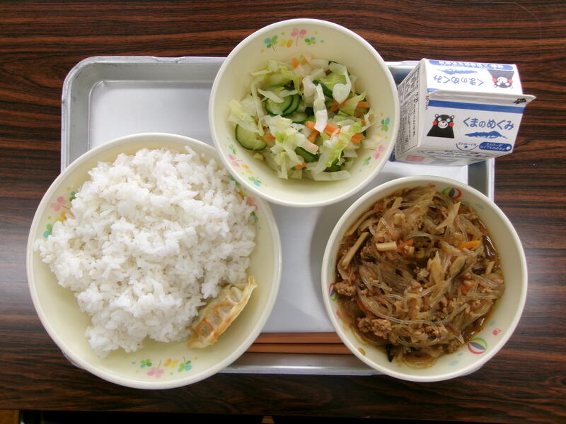 今日の献立は、麦ごはん、肥後餃子、中華サラダ、マーボー春雨、牛乳でした。
