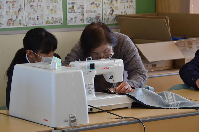 子供たちはGTに、しつけ糸の縫い方を正しく直していただいたり、ミシンで縫い間違った糸をとって正しく縫い直す手伝いをしていただいたりしていました。子供たちの実習が上手くいくように微に入り細に入り学習の