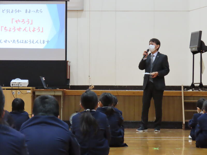 「毎日の生活の中では、やるかやらないか、どちらかを選ぶ場面というのがたくさんあります。そんなときに、やる方を選んでほしい。ただ見ているだけではなく、行動することで、違ったものが見えてきて、違った生活が始まります。それが皆さんの可能性を広げていくことに繋がるのです。どうしようか迷ったら『やりましょう』『挑戦しましょう』先生たちは、挑戦した君たちを応援します。」