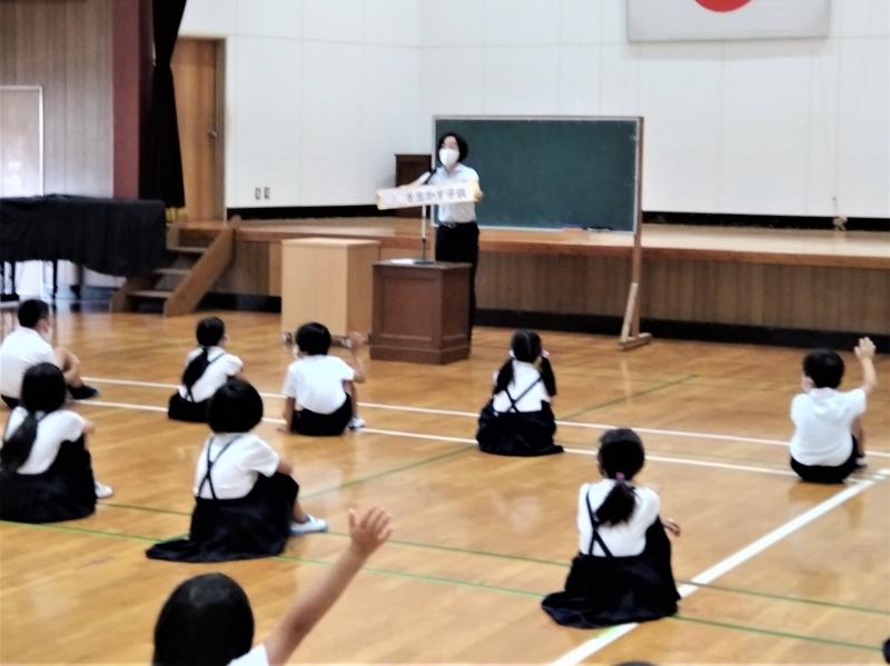 6月24日(木)、始業前の時間に全校集会を行い、教頭先生のお話を聞きました。