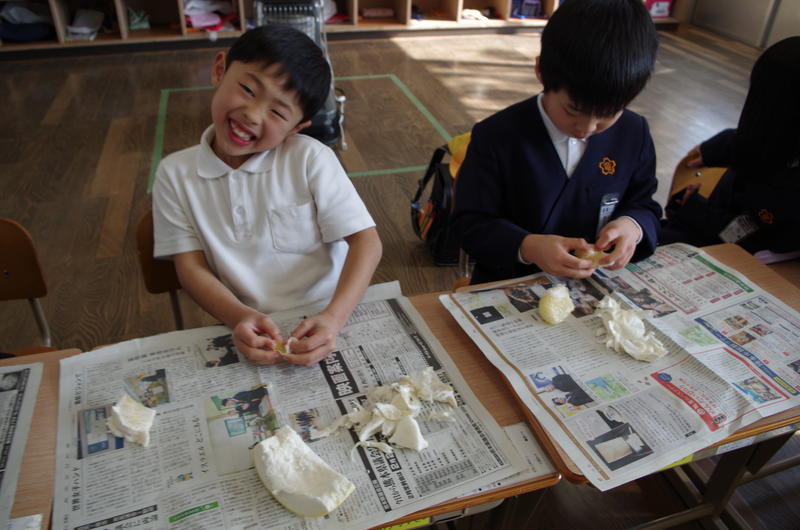 もらった晩白柚を、各学年で分けて食べました。子供たちは、晩白柚においしそうにむしゃぶりついていました。