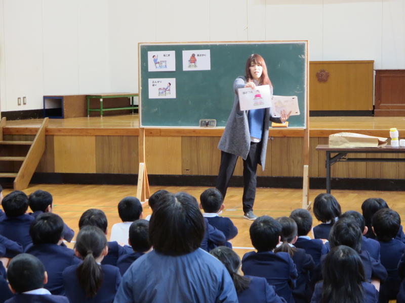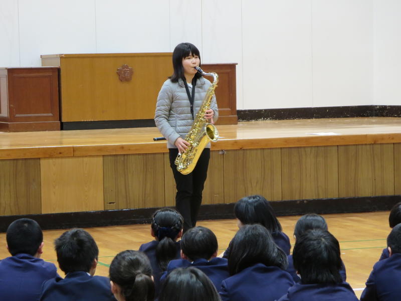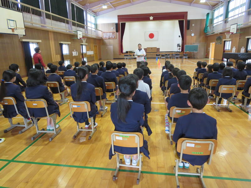 今日の児童集会では、若手の出口先生が、中学の頃から今でも続けているサクソフォンについて話をしました。サクソフォンのソロ演奏を披露すると、子供たちは「すごーい。」と目を丸くして見入っていました。いろんな事に挑戦してみることの大切さや一つのことを好きになってそれを続けていくことの素晴らしさを子供たちはきっと実感できたのではないかと思います。