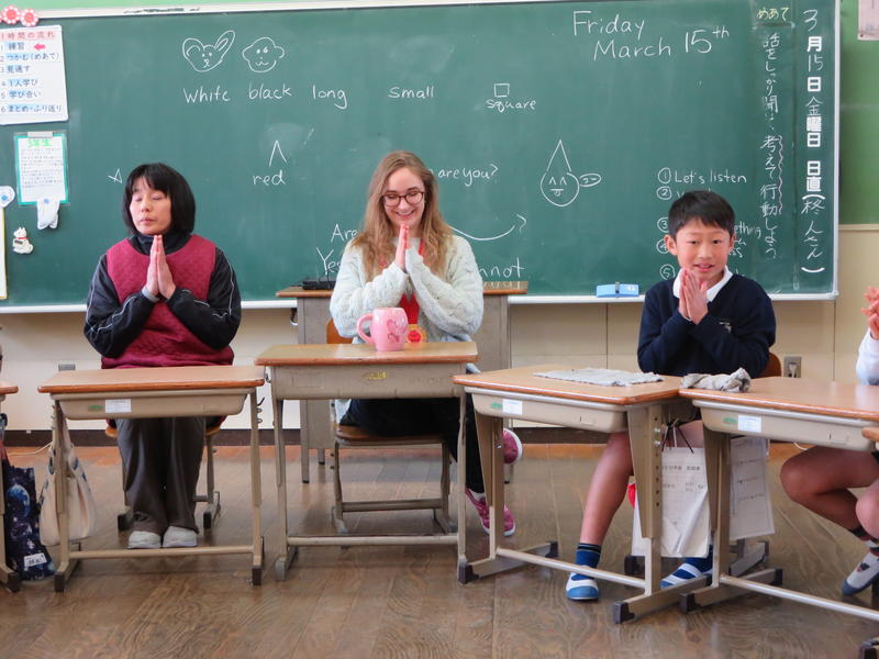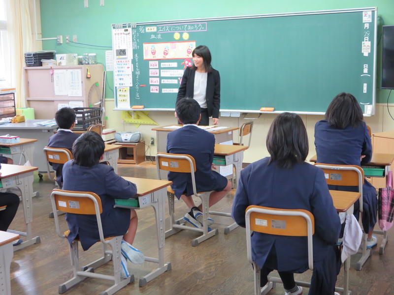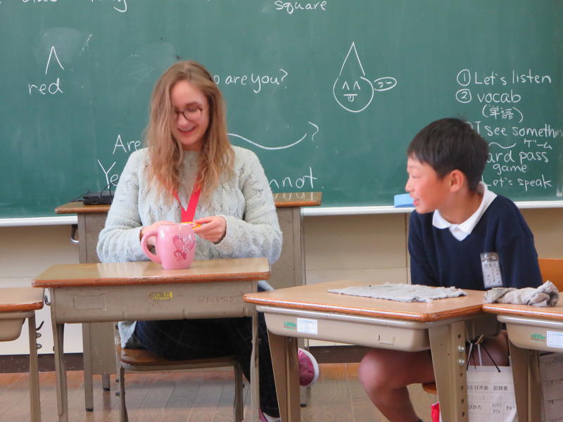 ALTのアマンダ先生には、いつも楽しく外国語を教えてもらっていますが、今日はアマンダ先生の誕生日でした。一緒に給食を食べた後、子どもたちがメダルをプレゼントしました。