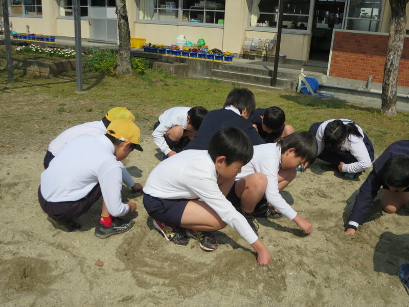 理科の時間、砂場で3年生の子どもたちが何やら探しているようです。いったい何をさがしているのでしょうか?