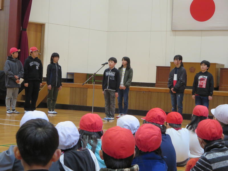 ・児童会新役員と旧役員が、それぞれに挨拶をしました。