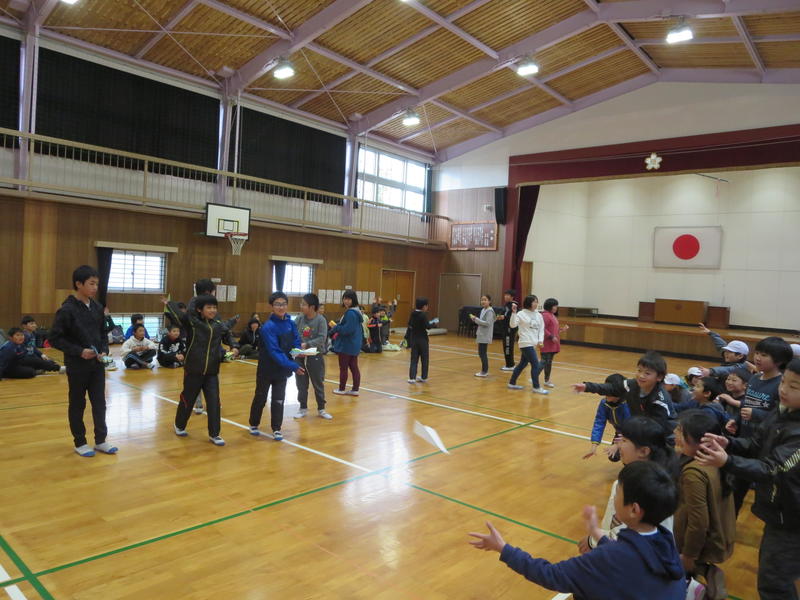 6年生からは、下級生に紙飛行機を飛ばして、これまでの感謝と励ましの気持ちを託しました。