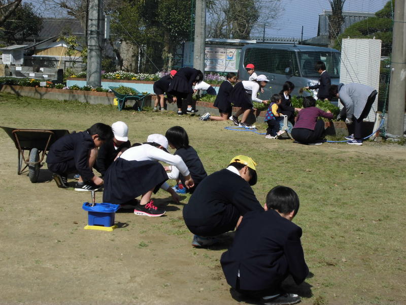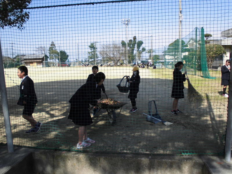 3学期も終わりに近づいています。卒業式も控えていますが、運営委員会と環境委員会では、クリーン作戦を計画しました。2時間目の休み時間に子供たち全員が仲良し班ごとに分かれて草取りや落ち葉拾いをしました。