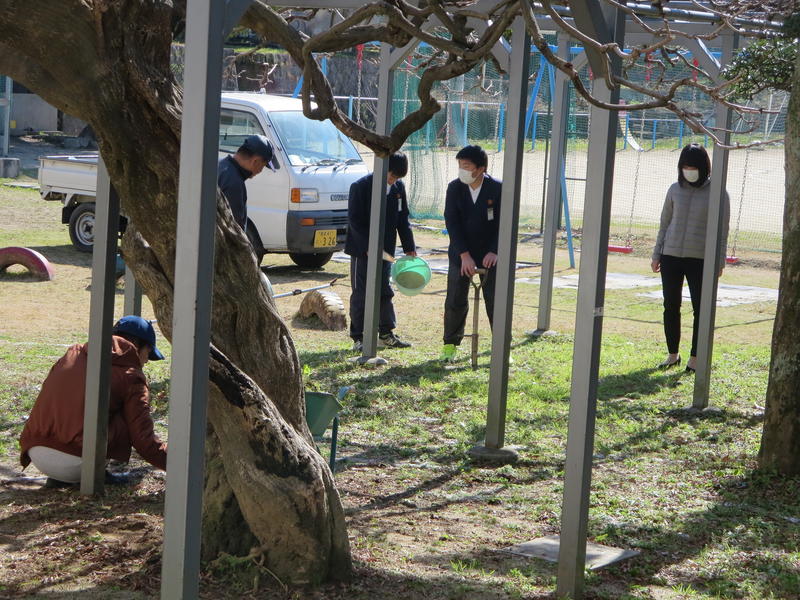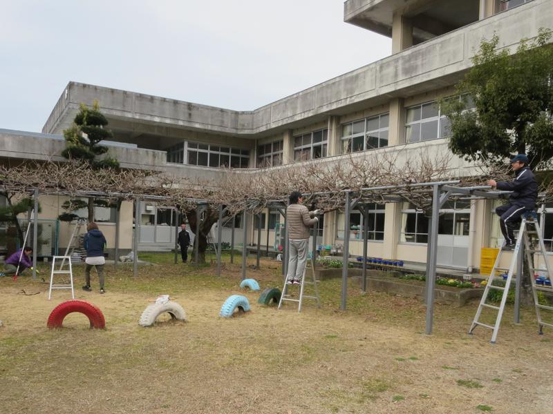PTA資源回収後に、PTAの方々で藤棚の剪定をしていただきました。4月に藤棚給食を実施する予定ですが、その頃には、きっと、たくさんの藤の花が咲き誇ることだと思います。