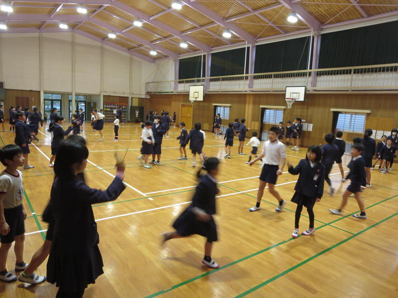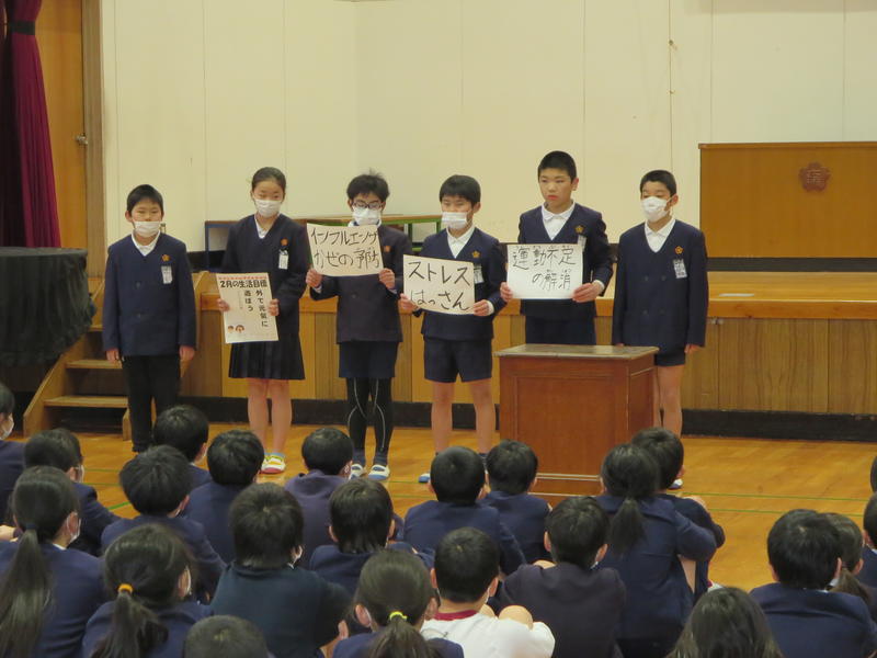 今日の朝は、児童集会を開きました。体育委員会が、今月の目あて「外で元気に遊ぼう」について、運動の良さについて詳しく説明して、めあてをみんなが実現できるように呼びかけを行いました。