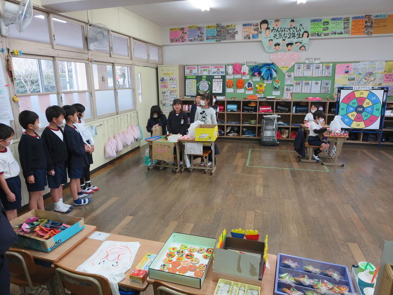 今日は、2年生が1年生を招いて、的当てゲームやつりゲームをして楽しみました。ひまわり学級からも、お店屋さんを開いて買い物を楽しんでもらいました。ゲームをする側してもらう側、買い物をする側してもらう側、みんな大満足な一日でした。