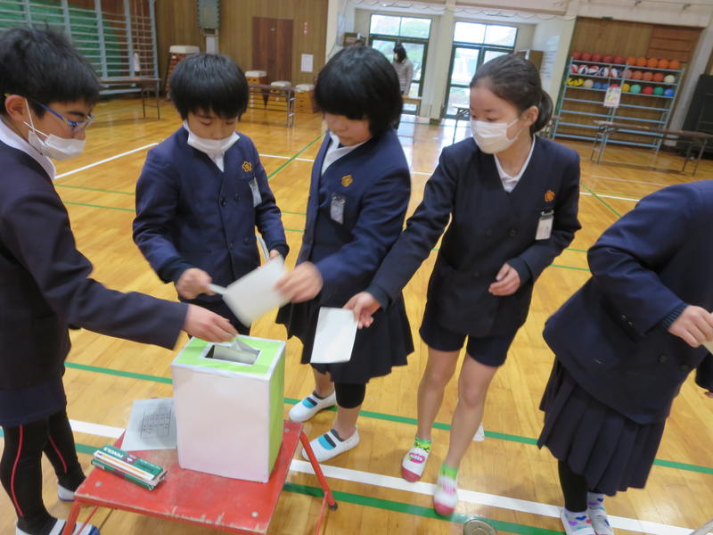 今日は、立会演説会と児童会役員選挙を行いました。4年生から5名、5年生から7名の立候補者が、選挙演説を行いました。応援者を入れると学年全員が、この選挙に参加して、どんな学校にしたいのかを考えました。立候補者、応援者共に素晴らしい演説でした。