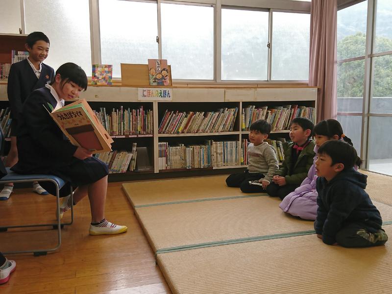 読み聞かせをする5年生の子どもたち。しっかりと話を聞いている子どもたちです。
