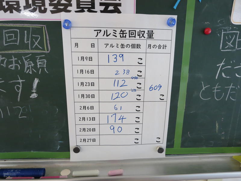 環境ISO委員会によるアルミ缶回収では、今日は、16人の子供たちの協力を得て、173缶集まりました。