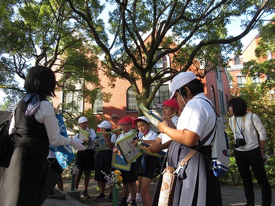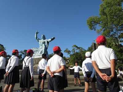 長崎修学旅行(6年生) 投稿日時 : 2018/10/25 学校サイト管理者 今日から6年生は、長崎修学旅行に出かけました。1日目は、長崎市内を巡り、平和学習をしました。太平洋戦争で70年あまり前に、原爆が落とされた長崎ですが、平和公園、浦上天主堂、如己堂などを歩いて回り、くわしく話を聞きながらフィールドワークをしていきました。 平和公園では平和集会を開き、犠牲者の冥福を祈ると共に、平和の誓いを立てました。ホテルに到着! お楽しみの夕食でした。 {{options.likeCount}} {{options.likeCount}}