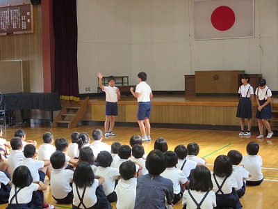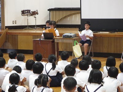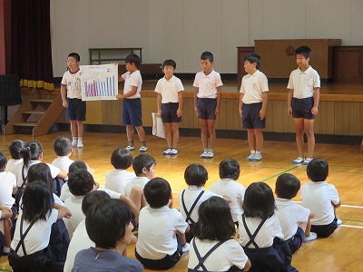 児童集会(環境ISOとあいさつについて) 投稿日時 : 2018/09/06 学校サイト管理者 今日の児童集会では、環境委員会から1学期の電気や水道の使用量についてグラフを紹介して、これからの電気や水道の使い方について呼びかけをしました。 また、運営委員会からは、挨拶の仕方についてみんなで話し合ったり、寸劇を見たりする中で、気持ちの良い挨拶をするにはどうしたらよいかを考えました。 2学期が始まって子どもたちの体のリズムが次第に整ってきたところです。充実した2学期を送れるようにしていきたいですね。 {{options.likeCount}} {{options.likeCount}}