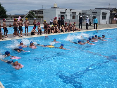 プール開き 投稿日時 : 2018/06/18 学校サイト管理者 本日、プール開きを実施しました。梅雨の時期ですが、今日は晴天に恵まれ、子供たちは大はしゃぎでした。 誓いの言葉を立派に発表しました。 水中じゃんけんをしたり、ビート板を使ったりして、泳いでみました。これから、決まりを守りながら泳ぎ方の練習をがんばっていこうと思います。 {{options.likeCount}} {{options.likeCount}}