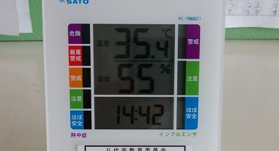 猛暑の中、勉強にがんばっています。 投稿日時 : 2018/07/19 学校サイト管理者 今年度は、連日、例年にない暑さに見舞われています。今日の教室の温度は35度を超えていました。そんな中、子供たちは勉強に頑張っています。まるでサウナ風呂の中のような、うだるような暑さの中、各教室では、昨年度付け替えられた最新式の扇風機がフル稼働、大活躍していました。 いよいよ明日は終業式ですが、体調を崩さないようにして1学期最後の日を迎えてもらいたいです。 {{options.likeCount}} {{options.likeCount}}