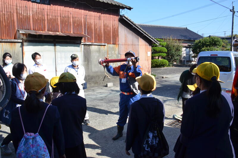 また、八代市消防団八代方面第31分団岡町小路班の施設や消火栓を見せていただいたり、ポンプ積載車に乗ったり、ホースのつけ外しを習ったり、筒先を持ったりして本物に触れることもできました。