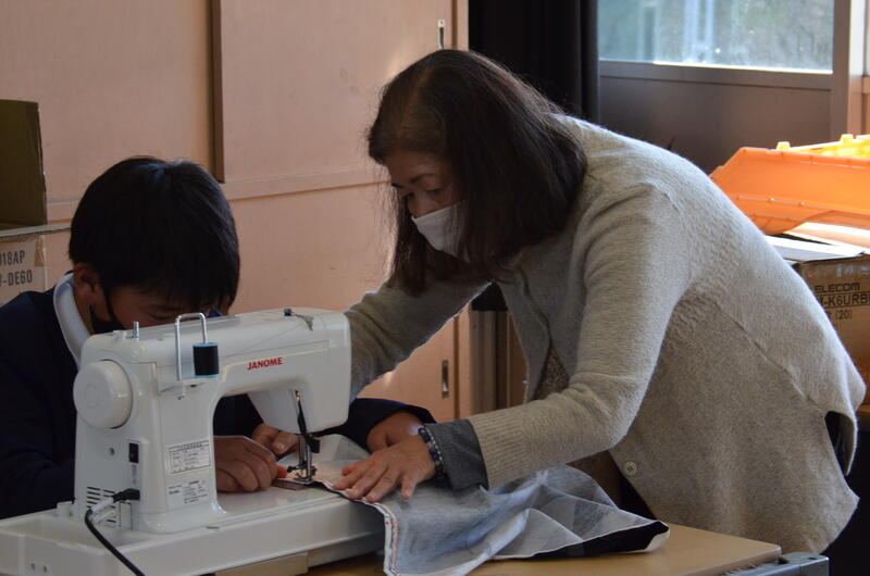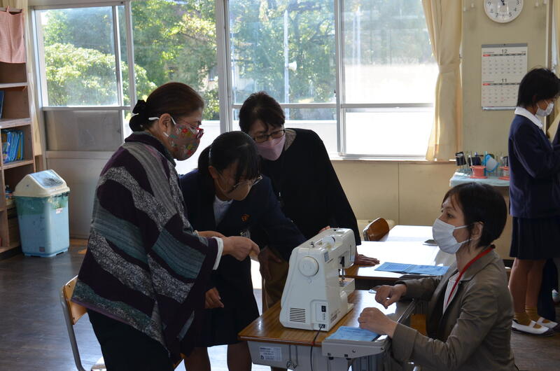 子供たちはGTに、しつけ糸の縫い方を正しく直していただいたり、ミシンで縫い間違った糸をとって正しく縫い直す手伝いをしていただいたりしていました。子供たちの実習が上手くいくように微に入り細に入り学習の