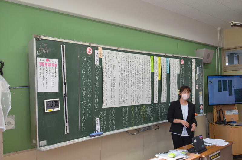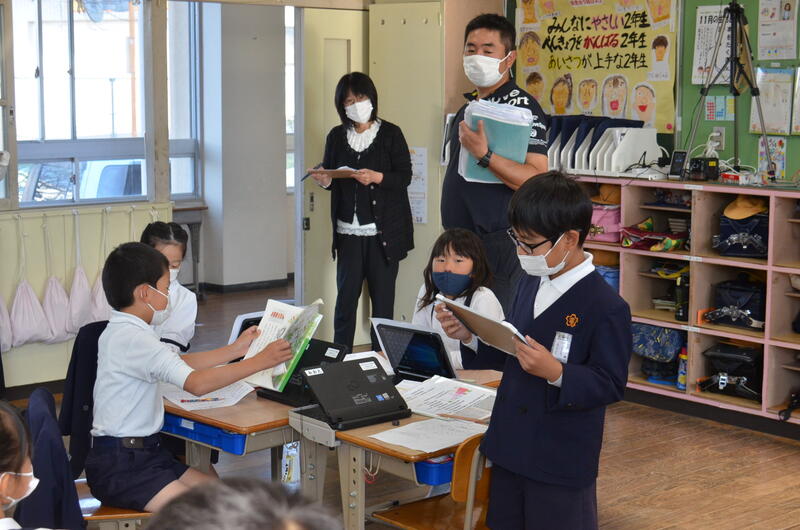 2年生の子供たちは、担任の岩﨑先生がまとまりの順序を入れ替えた文章と教科書の文章を読み比べて、「入れ替えたらおかしい」と考えた理由を一人一人文章に書いて、グループのメンバーに伝えたり、グループで出た意見を全体に広げたりする学習活動を行いました。