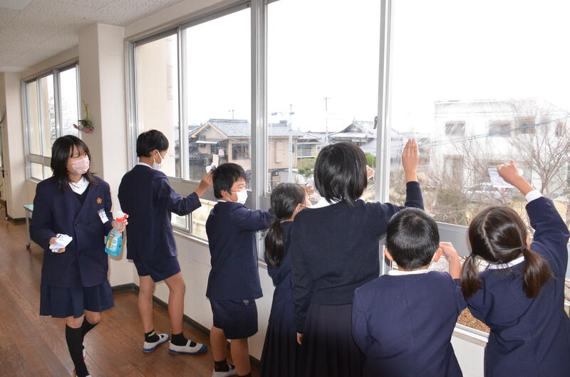 11月17日(木)の業間に、体育・環境委員会が企画しましたクリーンタイムを行いました。今回はガラス窓拭きをしました。6年生のリーダーが、縦割り班のメンバーを担当する場所に案内して、ガラス窓を拭いたり、磨いたりしました。大掃除には少し早いですが、これをいい機会にして年末までに全部の窓をきれいにしていきたいです。