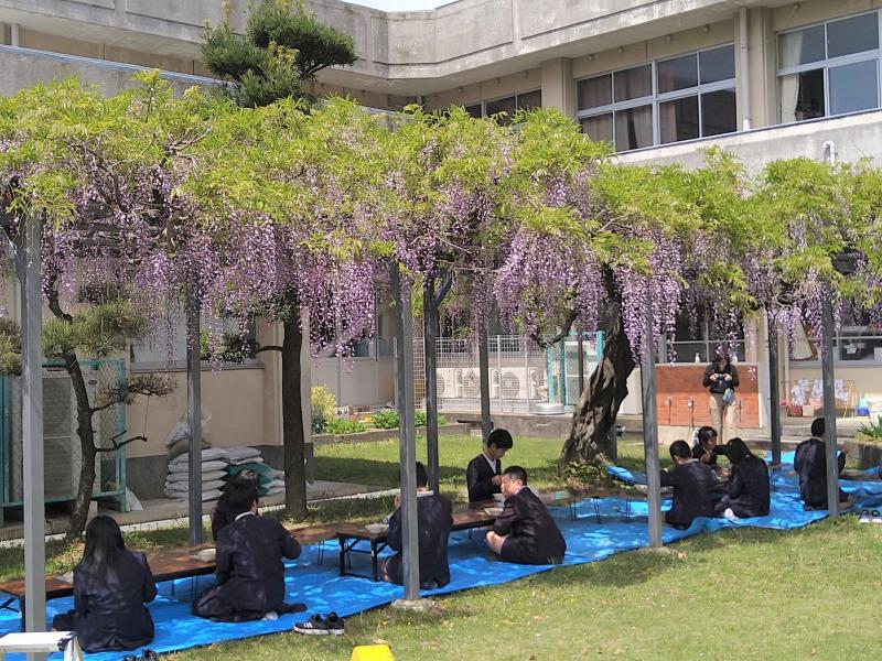 子供たちは、美しい藤の花の下で楽しそうに当日のメニューであった和食を味わっていました。