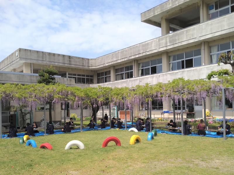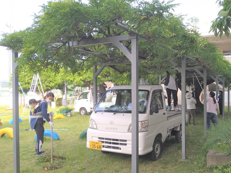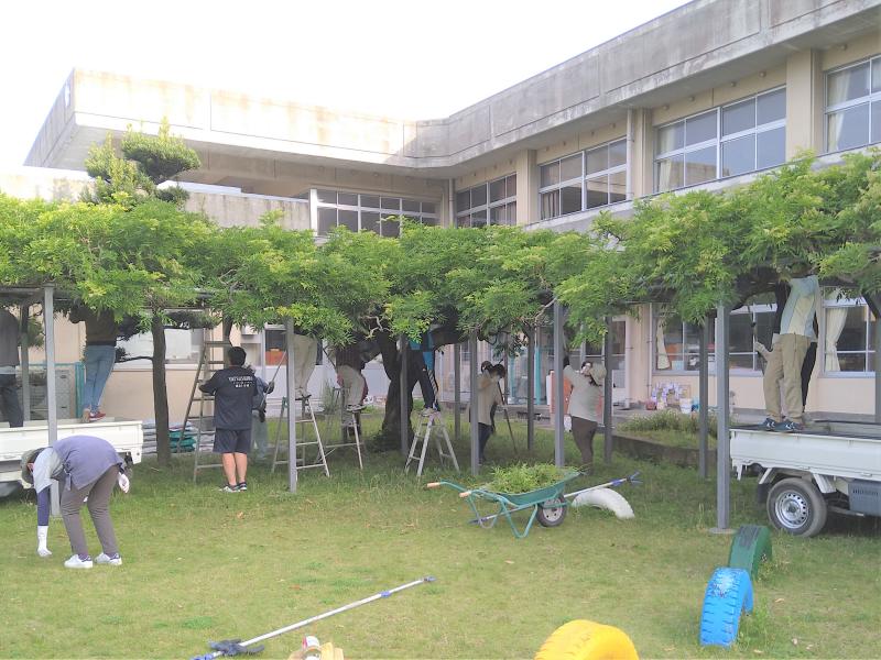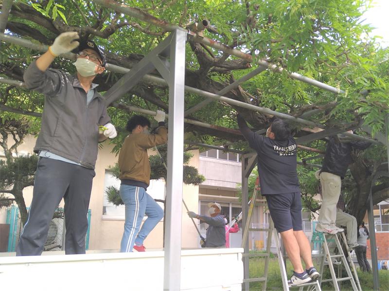 5月9日(日)の午前7時から、本校の藤棚の剪定作業が、興善寺町の川上様のご指導のもと、川田東町と岡町谷川の保護者の皆様、PTA運営委員及び各地区委員の皆様によって進められました。休日の早朝にもかかわらず、お集まりいただいた皆様に心より感謝申し上げます。