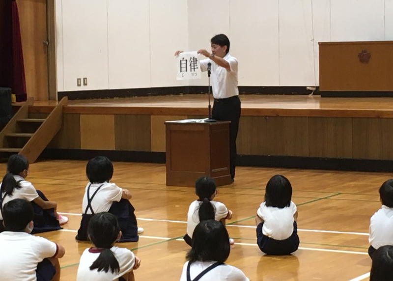 9月17日(木)の全校集会(校長講話)で、子供たちに「自律」(節度を保つ)を「線を引く」というイメージの力を借りて話しました。