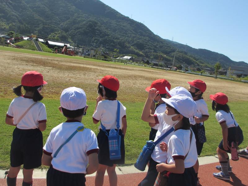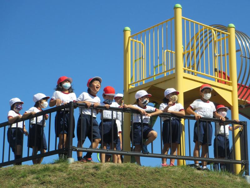 公園で秋探しをした後は、子供たちは遊具などで遊びました。また、音楽科で「やまびこごっこ」の学習をしたので、みんなで龍峯山に向かって「やっほ~~~」「やまびこさ~~~ん」と呼びかけていました。