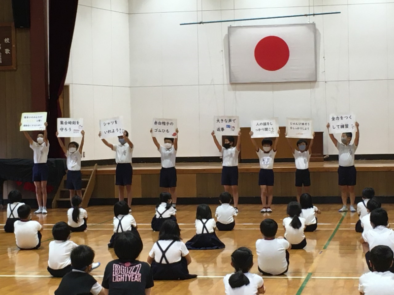 本校では、年度当初から、基本的な学校生活習慣の育成として、「八代スピリッツ」(あいさつ、ききかた、そろえかた)、「自分の心に線を引く」に取り組んでいます。その成果が、入学してまだ一年に満たない1年生にも現れていることを大変嬉しく思っています。