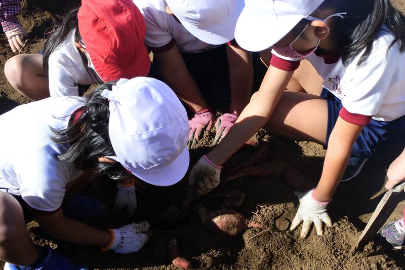 春に植えた苗は、地上にその葉を茂らせ、地下の根に養分をいっぱい蓄えていました。子供たちは、大きな芋を掘り当てると、満面の笑みを浮かべてとても楽しそうにしていました。収穫した芋は、平等に分配し、子供たちがその日のうちに持ち帰りました。
