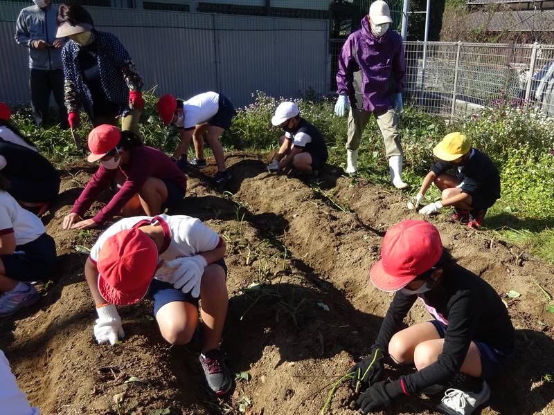 当日は、地域にお住まいの福島様ご夫妻と下川様においでいただき、子供たちが掘りやすいように茎や葉を切り落としたり、被せていたビニルシートをはがしたりする下準備や堀り方の指導などをしていただきました。