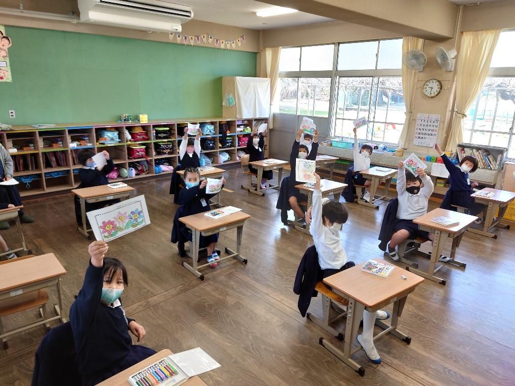 その後は、塗り絵に示された数字を、アマンダ先生が言われた色で塗っていきました。するととってもかわいいお花の絵が完成!カラフルなお花に大喜びの子供たちでした。