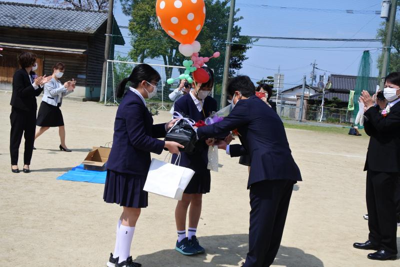 退任される田中先生。運営委員会の児童からお礼の言葉があり、PTAからもお花をいただきました。4月からの約4か月間ありがとうございました。8月から高田小学校で勤務されます。