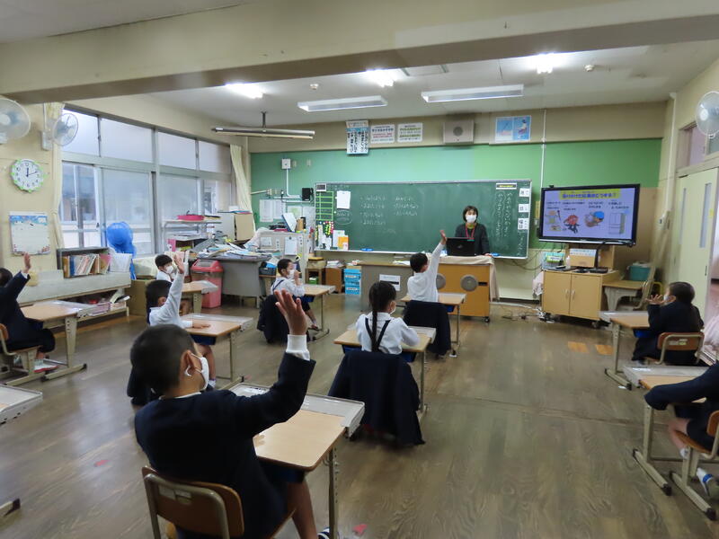 当日は、中部給食センター所属の林田栄養教諭に来ていただき、給食センターに関する説明や食べることの大切さ等について、専門的な知識を基にご指導いただきました。子供たちは、その内容に興味津々で、よく聞き、よく考え、よく発表するなど、積極的に参加していました。その成果でしょう。授業後の給食では、嫌いな野菜を食べる子供がいました。