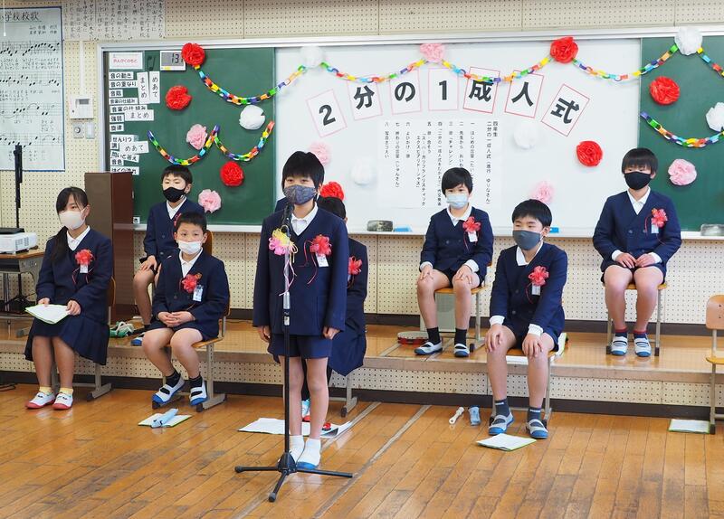 3月9日(水)、4年生児童は、「2分の1成人式」に参加しました。本来なら、保護者の方をお招きし、お子様のこれまでの成長を見ていただいたり、今後の決意を聞いていただいたりしたいところでしたが、まん延防止等重点措置の延長により、今回は式の様子を撮影したものを1人1台タブレットPCに保存し、各ご家庭にてご覧いただくようにしました。