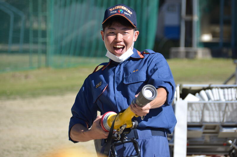 消防隊員の仕事では、隊長の号令ひとつで、消防ホースを延長したり、目標を定めて放水する訓練も見せていただきました。子供たちも、筒先を実際に構えて放水することを体験することができました。