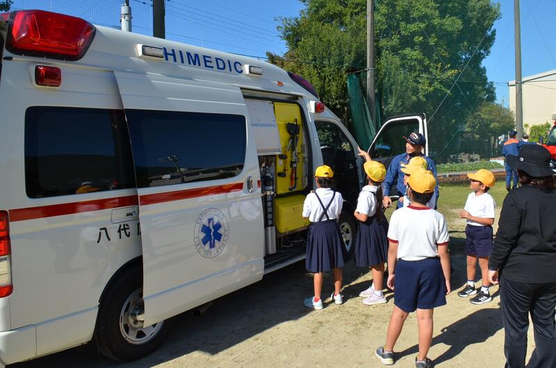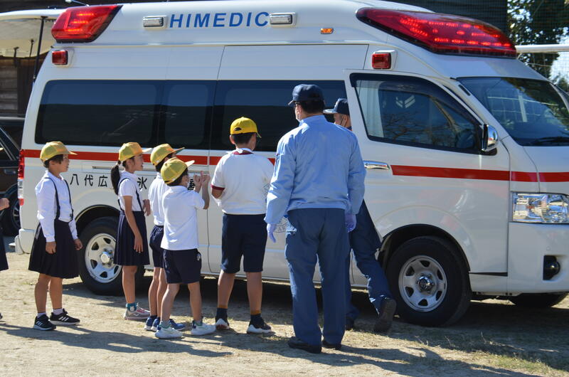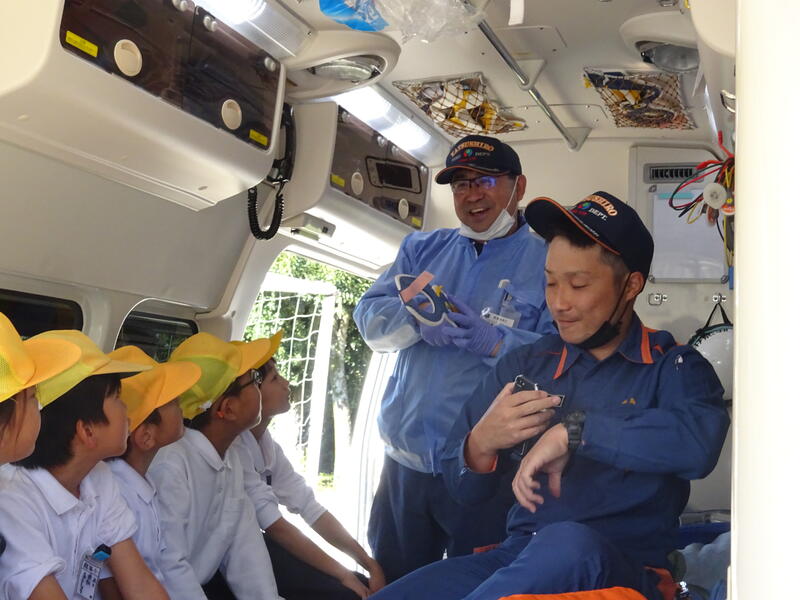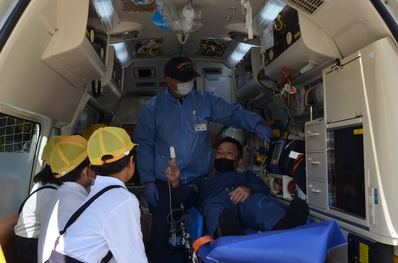 本来なら、消防署に行かないと観ることができない消防車や救急車を学校に移動させていただいたり、消防隊員の緊急出動の様子や消火活動の様子を実演を交えながら丁寧に説明していただきました。また、特殊な工作機械の使い方を見せていただいたり、消防車に乗せていただいたりしました。救急救命の隊員さんからは、救急車の中に取り付けられた機器や救急救命士の仕事について説明していただきました。