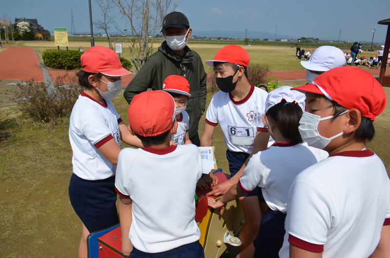 お別れ遠足は近くの龍峯やまびこ公園まで歩いていき、5年生が企画した全員参加のレクリエーションや縦割り班の謎解きゲームを楽しみ、最後のふれあいを惜しんでいました。