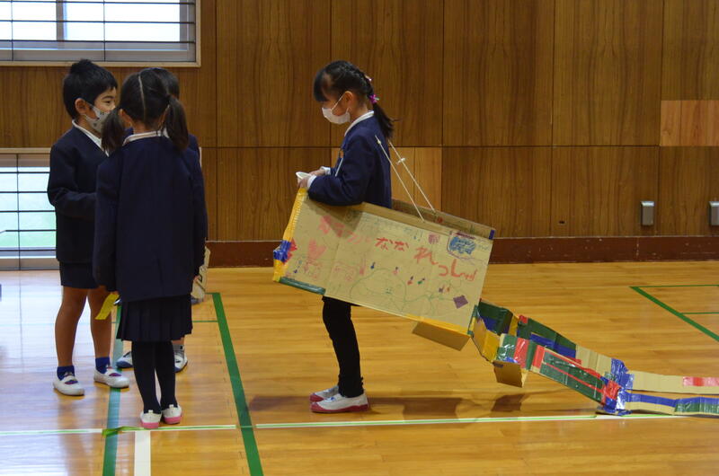 2年生は、おもちゃランドを開くための準備をしっかり進めてきましたので、1年生のおもてなしも上手にできていました。また、2年生の工夫は、おもちゃのブースだけではなく、TDLのようなおもちゃランドを案内する列車も用意していて、一人一人に出会いと出番が準備されたとても素敵なおもちゃランドを作っていました。