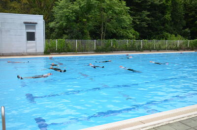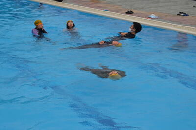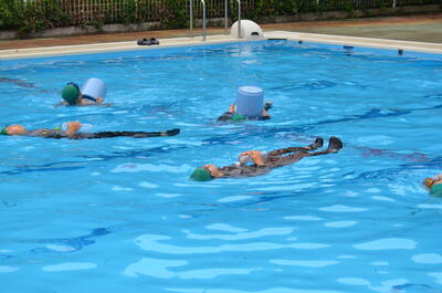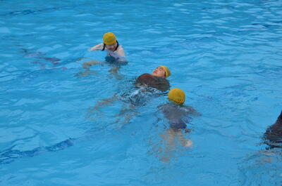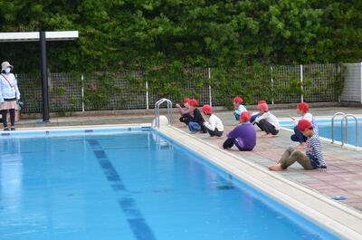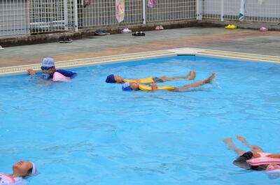 服を着たまま泳ぐとどうなるか。助けを待つためにどうするか。自分が救助をするときは何をするかなど場面ごとに考えながら、自分の身を守る行動を学習していました。