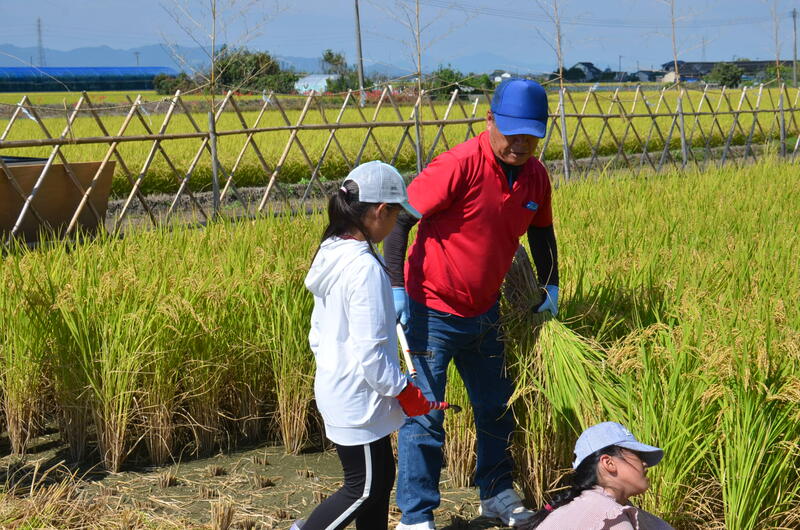 また、午後から、抜穂祭の後行事になる「稲刈り」にも子供たちが参加しました。地域の方々にご指導やお手伝いをいただきながら、八代農業高校の生徒と一緒に、一株一株手で刈り取る作業を行うことができました。