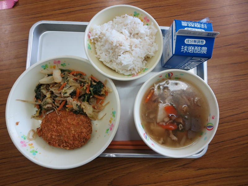 給食週間最後の日は、郷土の特産物の食材を使ったメニューで、馬肉コロッケが出されました。昨日は、玉名地域の特産物の南関揚げやイチゴをいただいた子供たちでしたが、馬肉コロッケにも興味津々でおいしくいただきました。
