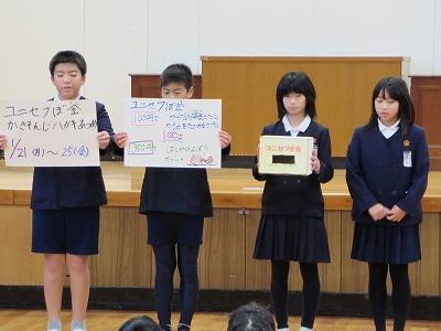 今日の朝の児童集会では、運営委員会から「ユニセフ募金」と「書き損じはがき」についてのお願いがありました。募金の期間は、1月21日(月)から1月25日(金)までです。皆様のご協力をよろしくお願いします。
