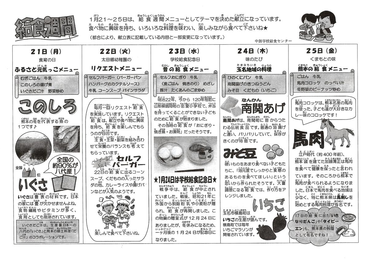 給食週間最後の日は、郷土の特産物の食材を使ったメニューで、馬肉コロッケが出されました。昨日は、玉名地域の特産物の南関揚げやイチゴをいただいた子供たちでしたが、馬肉コロッケにも興味津々でおいしくいただきました。