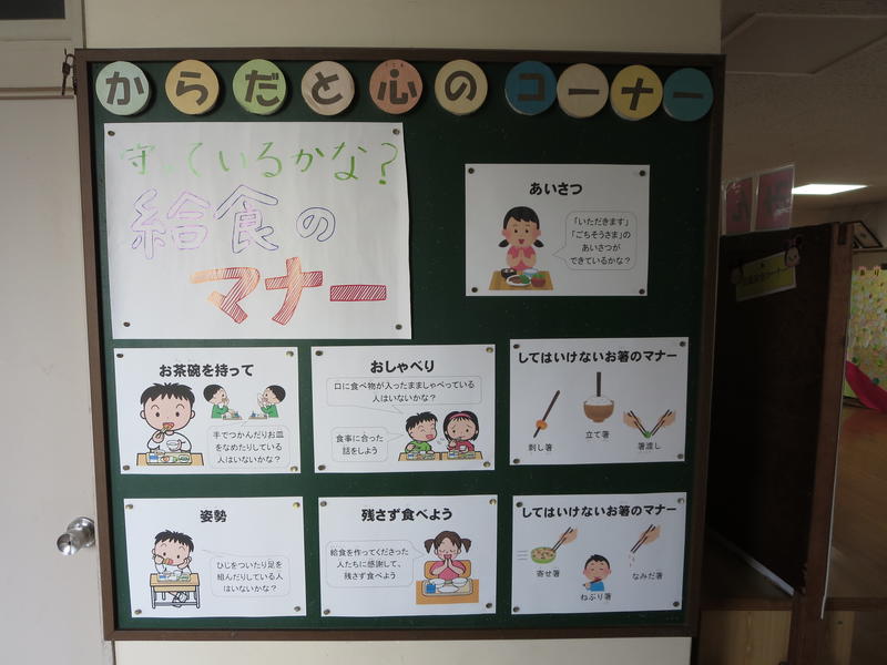 給食週間では、毎日心のこもった給食メニューが楽しめます。同時に、毎日の給食でのマナーや感謝の心を今一度ふり返っています。下の写真は、廊下に貼った掲示物です。ご家庭でも話題にしていただけると幸いです。